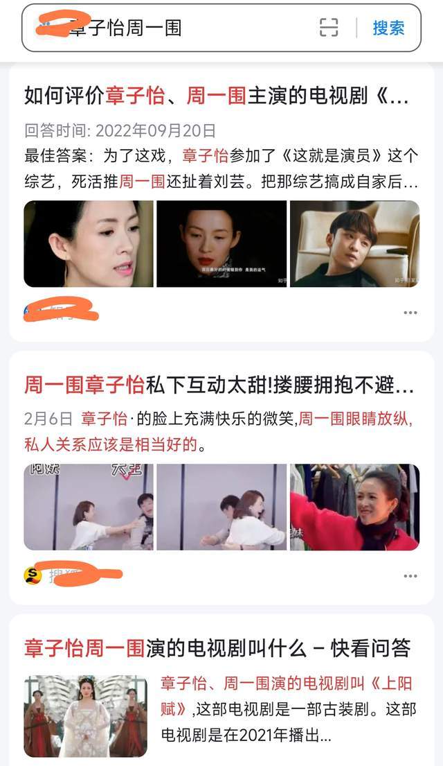 5、搜索“章子怡和z姓艺人”,出来的结果是章子怡和周一围的《上阳赋》和一些综艺节目,两人那时候就被网友吐槽过于亲密。
